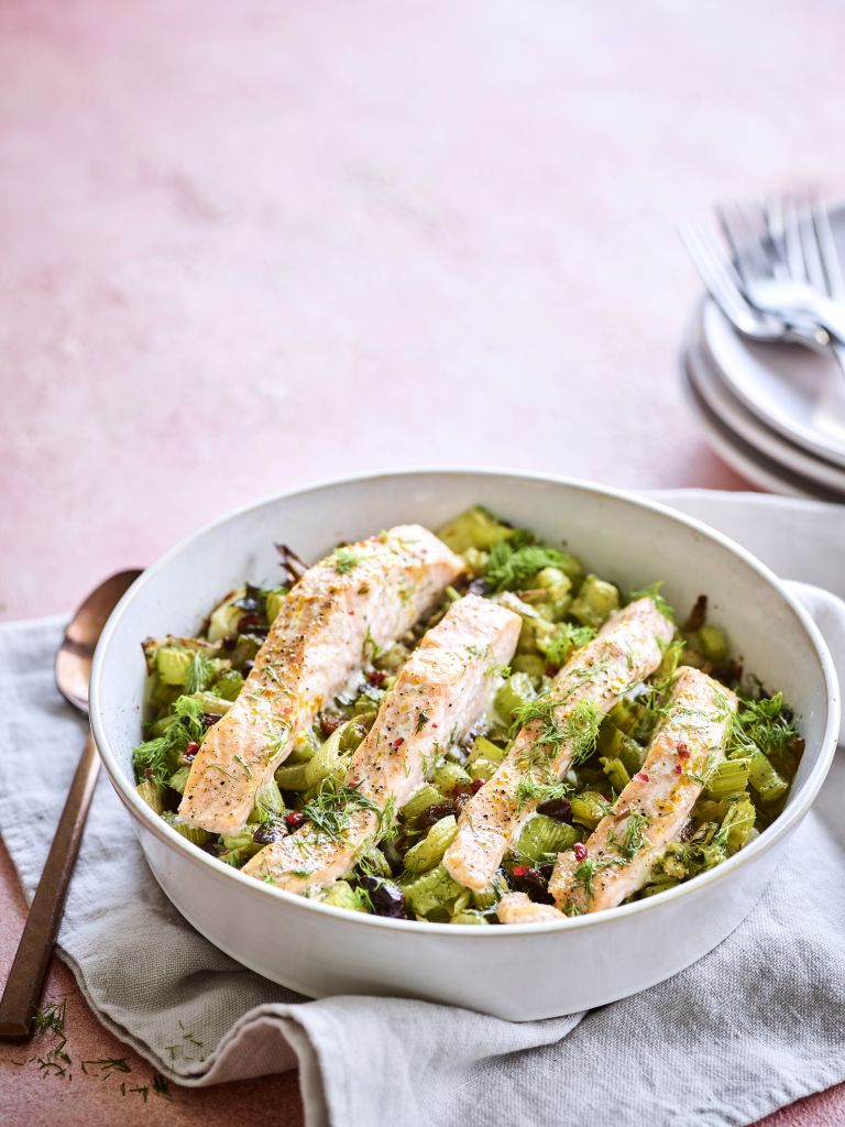 Yotam Ottolenghi: “Als je de tomaten-ansjovisolie één dag van tevoren maakt, kun je genieten van het feit dat je binnen 20 minuten een doordeweekse maaltijd op tafel kunt zetten. De snelle en zorgeloze bereidingswijze – hallo traybake! – en de sterke smaken – hallo puttanesca! – maken er een groot succes van.”
