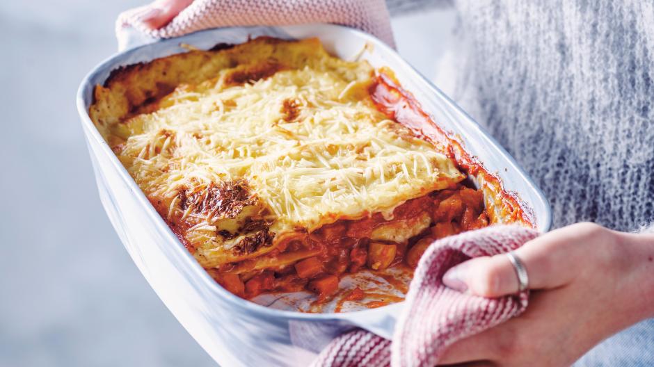 Schep niet meteen op wanneer het gerecht uit de oven komt, maar laat het nog enkele minuutjes staan. Zo kan de kaas weer wat hard worden en krijg je dat krakende korstje.