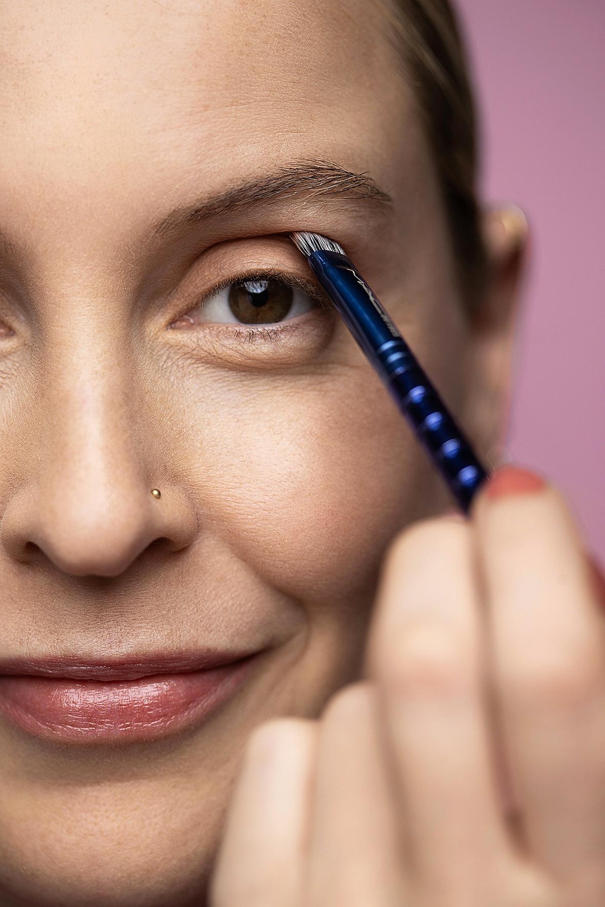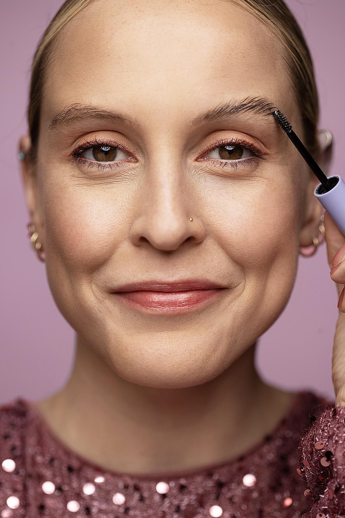 Start aan het begin van je wenkbrauw en kam elk haartje strak omhoog. Je mag best wat druk zetten: bedoeling is dat de haartjes tegen je huid kleven. Heb je lange haartjes, dan kun je de puntjes bovenaan wat platter duwen met de tip van je wenkbrauwborstel. Haal restjes op je huid weg met een wattenstaafje en laat de gel opdrogen.