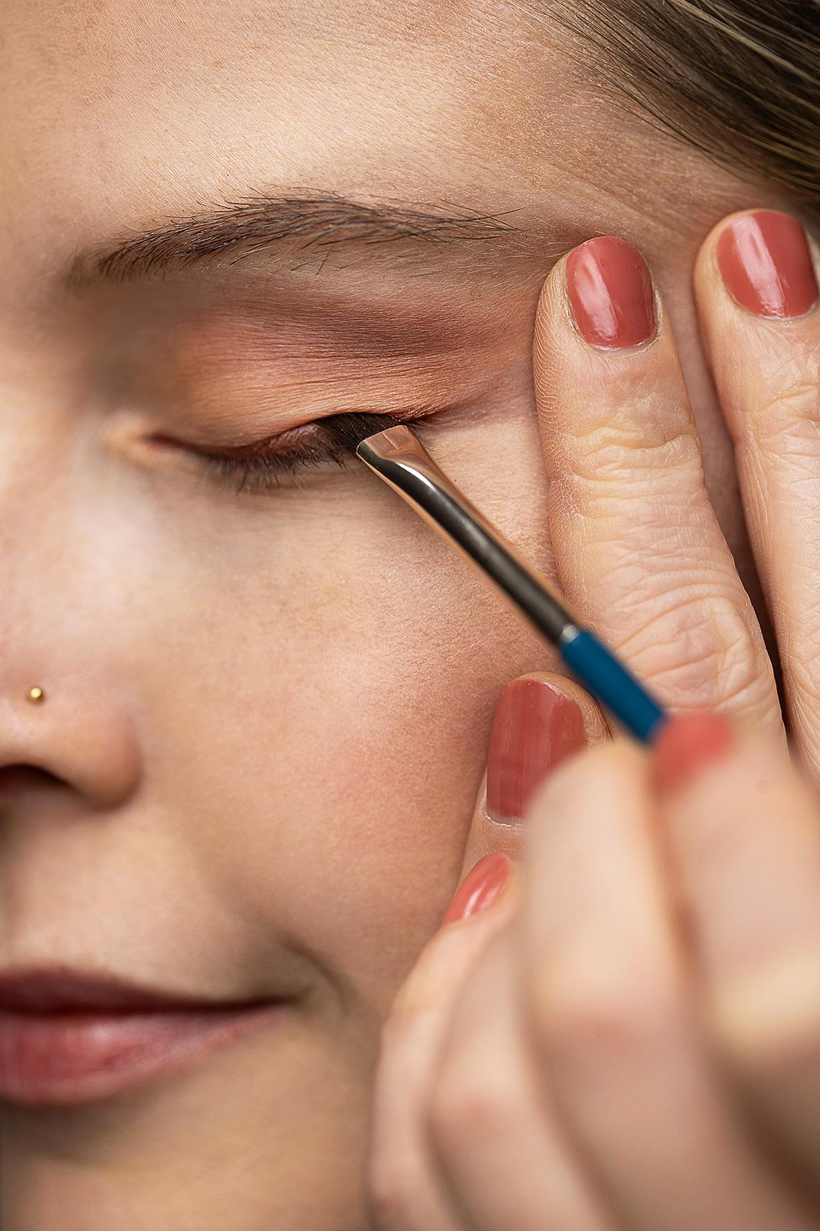 • Breng een matte, lichte tint aan op je bewegend ooglid met deppende bewegingen van je penseel. Zo duw je de oogschaduw stevig in het concealerlaagje dat je aanbracht in stap 1.
