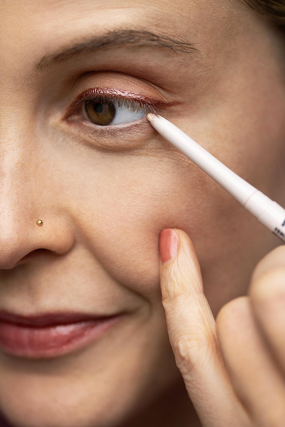 De waterlijn is het vochtige binnenrandje van je ogen. Afhankelijk van de kleur die je hier aanbrengt, kun je je ogen verkleinen en diepte geven of vergroten en liften. Hier kiezen we voor dat laatste.