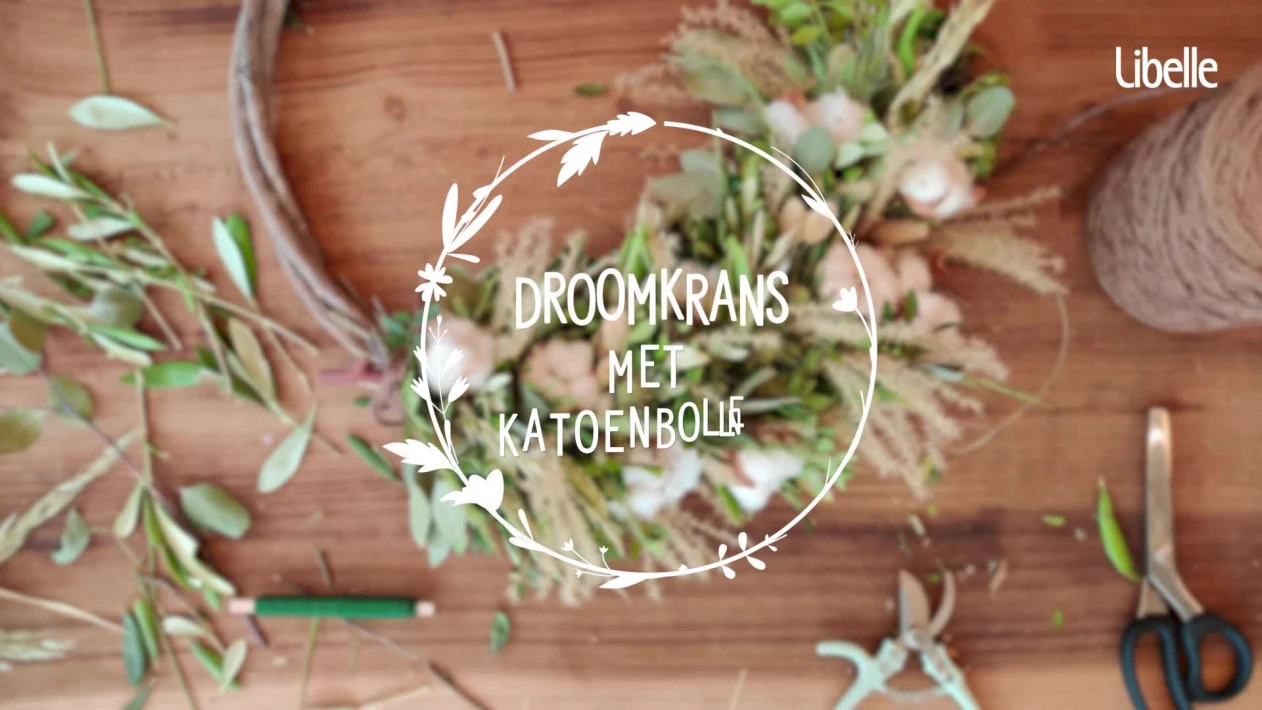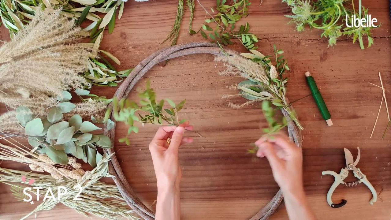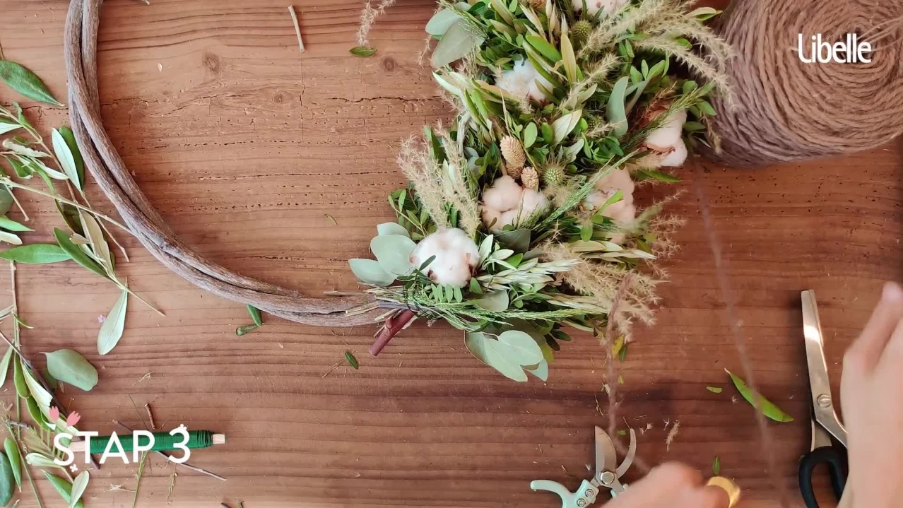 - STAP 1: Knip het verse groen in kleinere takjes van 15 à 20 cm. Verwijder het onderste blad over ± 10 cm. Knip ook de gedroogde grassen bij tot steeltjes van ± 10 cm. Knip de katoenbollen af met een zo lang mogelijk steeltje. Leg al het materiaal klaar in nette hoopjes. Wikkel de bloemendraad vast rond de krans. Maak een toefje met een mix van 5 à 6 verschillende soorten vers groen en gedroogd materiaal, en zet het met een paar wikkelingen rond de steeltjes vast op de krans.