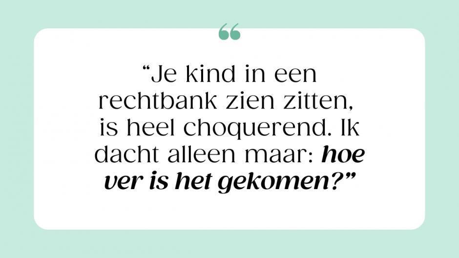 “Maar ook op je breekpunt kun je niet opgerold in dat bolletje blijven liggen. Je moet voort. Deze keer had Tom wel door dat hij te ver was gegaan en mede door dat schuldinzicht is de jeugdrechter mild geweest in zijn vonnis. Op de dag van de zitting was ik bloednerveus. Je kind in een rechtbank zien zitten, dat is heel choquerend. Ik dacht: hoe ver is het eigenlijk gekomen?