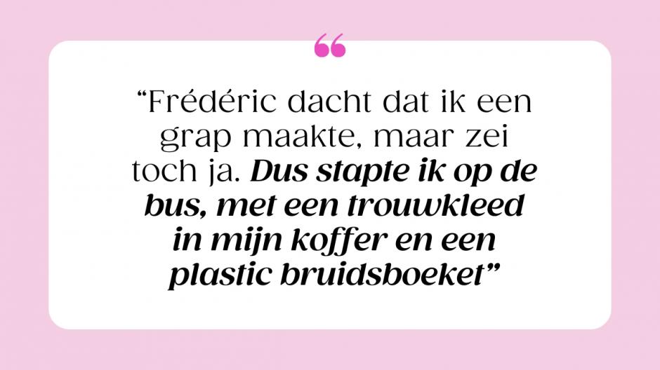 Hij zou tien dagen op verlof gaan in Kroatië, ik ging hem daar sowieso opzoeken, dus waarom niet trouwen daar? Frédéric dacht dat ik een grap maakte, maar zei toch ja. Ik heb alle nodige papieren laten vertalen en ben op de bus gestapt, met een trouwkleed in mijn koffer en een plastic bruidsboeket in mijn beautycase.