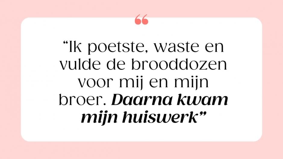 Was er geen eten, dan ging ik naar de supermarkt. Lag mama in bed, dan kookte ik. Hadden we geen propere kleren meer, dan deed ik de was. Als het huis vies was, poetste ik. Ik maakte de brooddozen voor mij en mijn broer, ik zette onze boekentassen klaar, ik lette erop dat we onze zwemspullen meenamen als we met school naar het zwembad gingen.