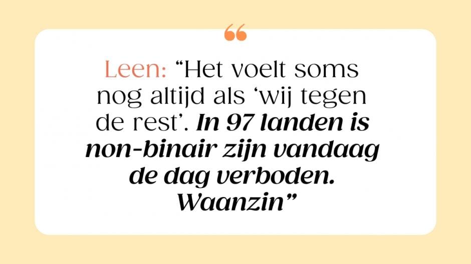 Ik snap ouders niet die hun kind buitengooien omdat het ‘anders’ is. Ik kan daar met mijn verstand niet bij. Maar het gebeurt wel. Toch voelt het soms nog altijd als ‘wij tegen de rest’. In 97 landen is non-binair zijn vandaag de dag verboden. Waanzin. En het gaat niet de goede richting uit. Trump ontslaat transgenders in het leger, en in Indonesië zijn twee mannen gestraft met stokslagen omdat ze hand in hand liepen. Je moet vandaag goed nadenken of je bij gender als non-binair nog wel een ‘X’ wilt zetten, want dat kan zware gevolgen hebben. We zijn allemaal toch maar gewoon mensen?”