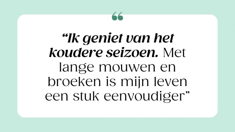 In de wintermaanden lukt het vrij goed, maar in de zomer is het moeilijk. Dat weegt op me. Ik kan nooit zomaar een luchtig zomerkleedje aantrekken. Ik let er altijd op dat mijn oksels niet zichtbaar zijn. Gaan zwemmen of een dagje strand vind ik de hel. Ik doe het wel, voor mijn kinderen. Maar er gaat een hele zoektocht aan vooraf naar een badpak met een rokje, of met franjes op de schouders zodat ik alles enigszins kan bedekken.