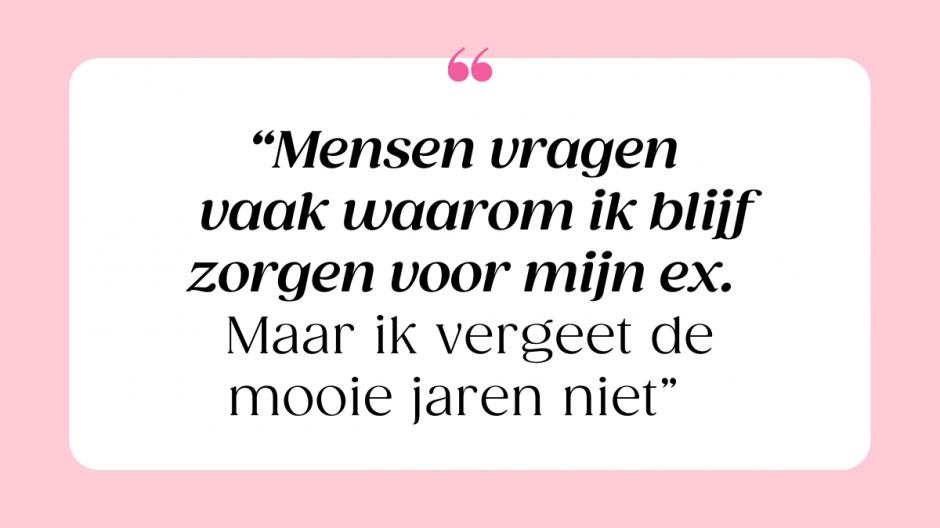 “Mensen reageren heel gemengd op wat ik doe. De ene vindt het bewonderenswaardig. De huisarts bijvoorbeeld, zegt vaak: ‘Chapeau voor wat je doet.’ Anderen kunnen het niet laten om er een scherpe opmerking over te maken: ‘Zorgen voor een ex, waarom zou je dát doen?’ Het is sowieso de vraag die ik het vaakst krijg: ‘Waarom?’ Meestal gevolgd door: ‘Jullie zijn al zo lang uit elkaar, je hoeft dit toch niet te doen?’