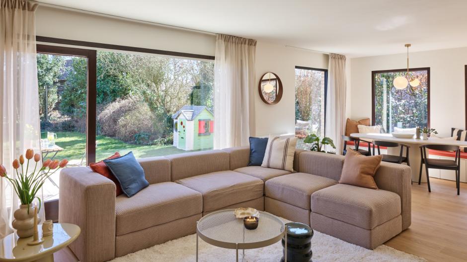 Een van de belangrijkste meubels in een woonkamer? Dat is zonder enige twijfel de zetel. De beige ribfluwelen zetel in deze Kempense woonkamer is de modulaire JÄTTEBO van IKEA, eentje die enorm uitnodigt om er meteen in neer te ploffen. Dorien is enthousiast over haar keuze: ‘Qua afmetingen en opstelling past dit model het beste in deze ruimte, vooral omdat hij los staat en niet tegen een muur. De opbergruimte in de zetel is mooi meegenomen, vooral voor speelgoed lijkt me dat hier handig!’ Het knuffelbare VOLLERSLEV tapijt brengt nog wat extra zachtheid in de ruimte.