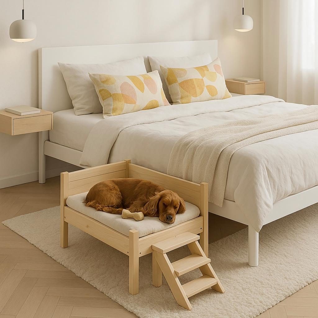 Veel honden dromen van een slaapplek dicht bij hun baasje(s). Wil je dat ook, maar is je eigen bed off-limits vanuit hygiënisch standpunt? Geef je hond dan een eigen bed naast het jouwe. Een slaapbank of stapelbedje is ideaal en koop je kant-en-klaar, bijvoorbeeld bij vidaxl (vidaxl.be), vevor (vevor.nl), of timmer je, als je wat handig bent, zelf in elkaar. Zeker bij kleine of oudere honden is een opstapje handig, zodat ze veilig in en uit hun bedje kunnen stappen. Kies voor een stevig (matras)kussen dat in de was kan en voorzie errond nog een extra hoes. Was het beddengoed van je hond wekelijks en stofzuig de slaapkamer geregeld om haren en stof te verwijderen.