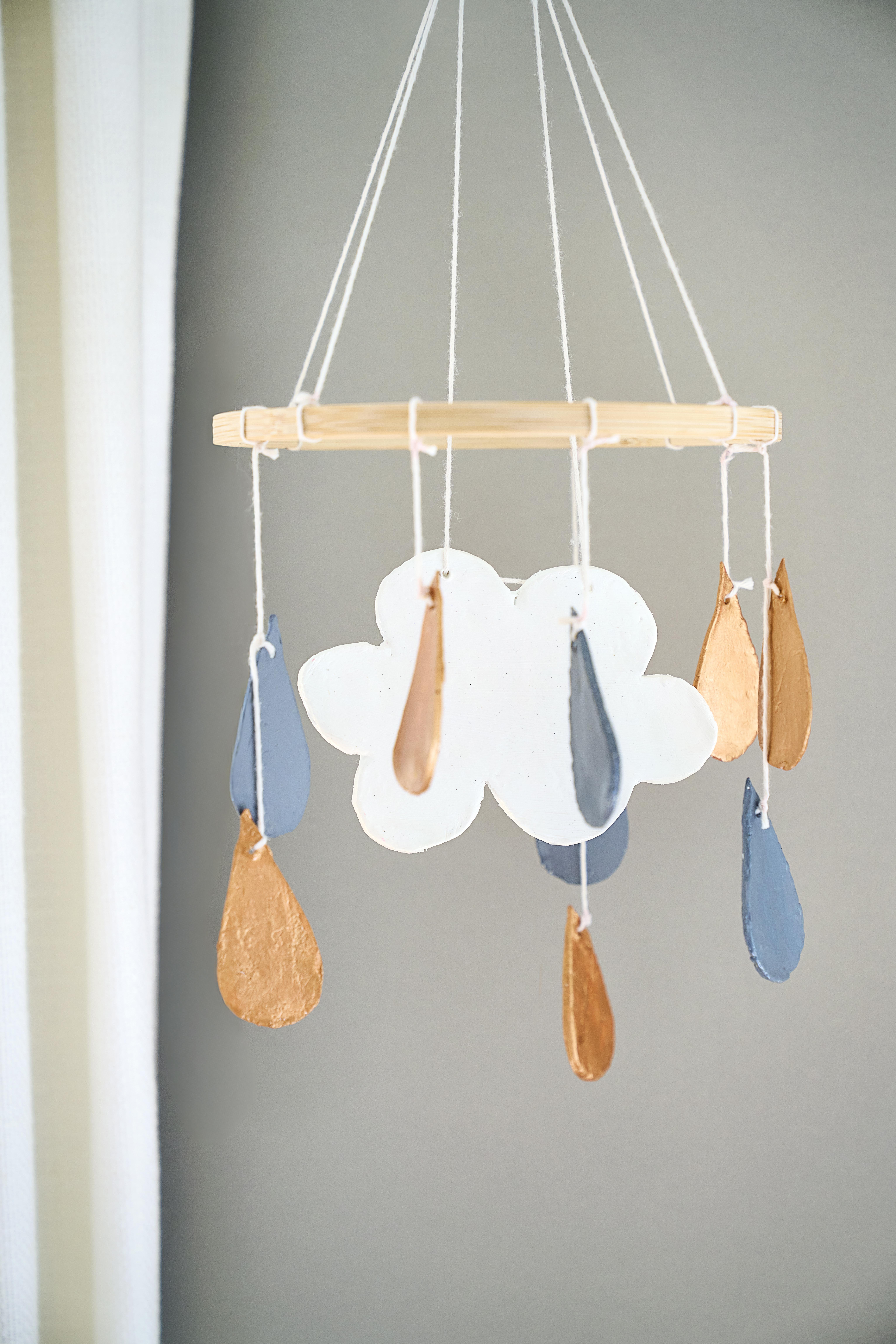 Een schattige mobiel voor in de kinderkamer, met een wolk en druppels van klei die zachtjes wiegen in de lucht.