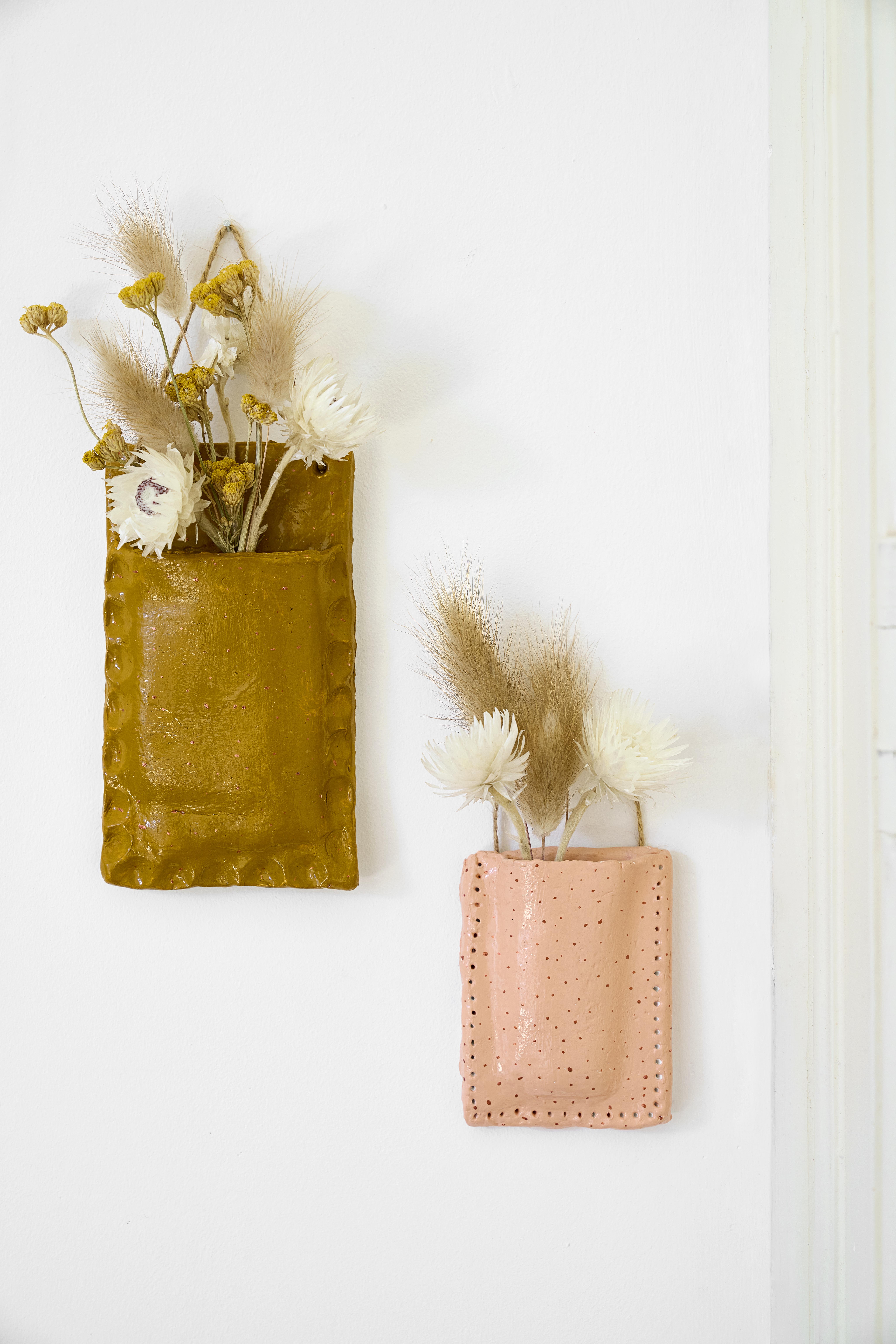 Deze ‘plantentasjes’ zijn ideaal om wat droogbloemen, pluimen… mee op te hangen aan de muur.