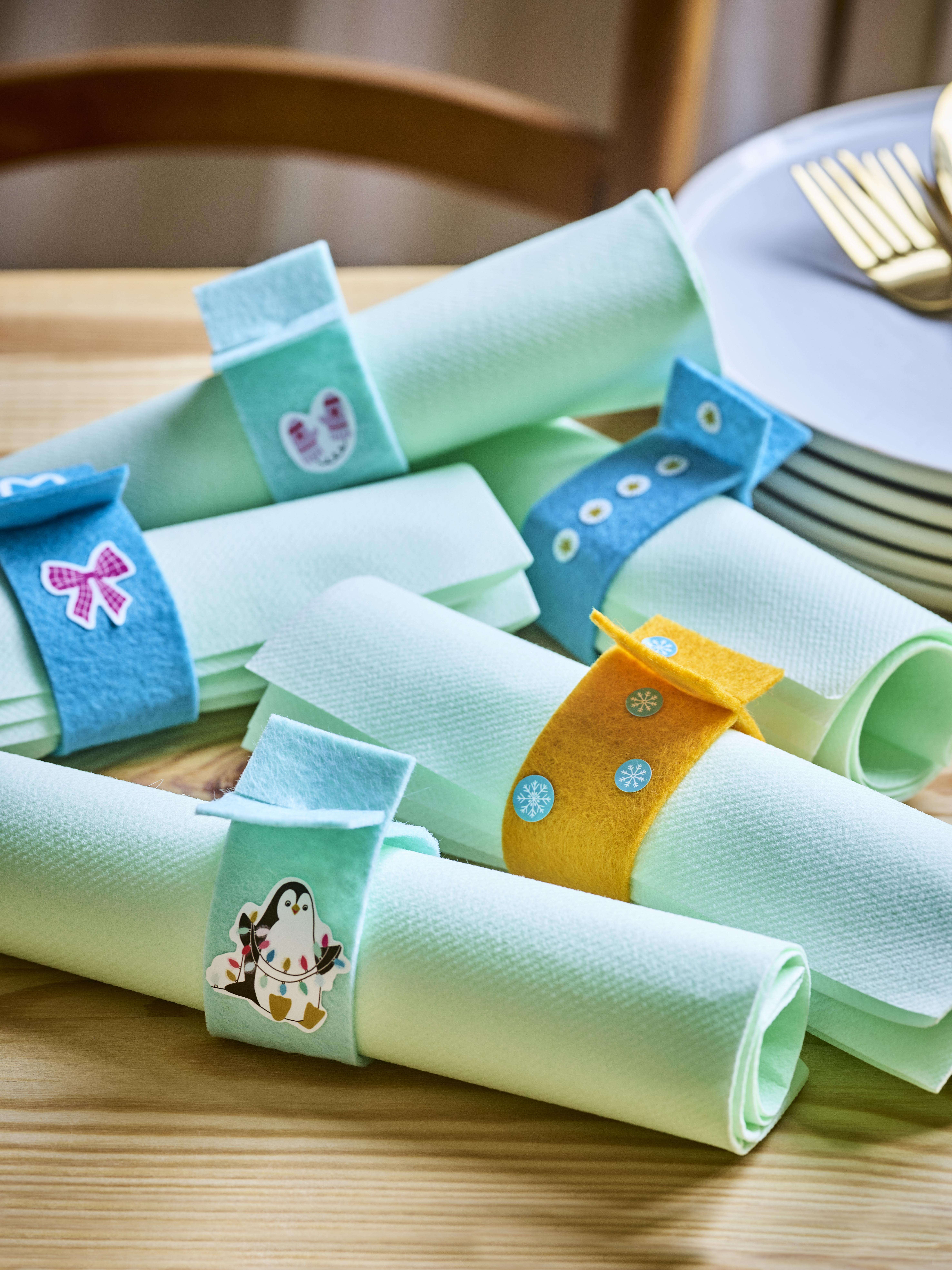 Zo doe je het: knip een reep van 20 x 3,5 cm uit het vilt. Knip op 2 cm van de rand 2 inkepingen tot in de helft van de reep, telkens aan de andere kant van de uiteinden. Plooi de servetring tot een rondje door de twee inkepingen in elkaar te schuiven. Beplak de servetringen met de Libelle stickers.