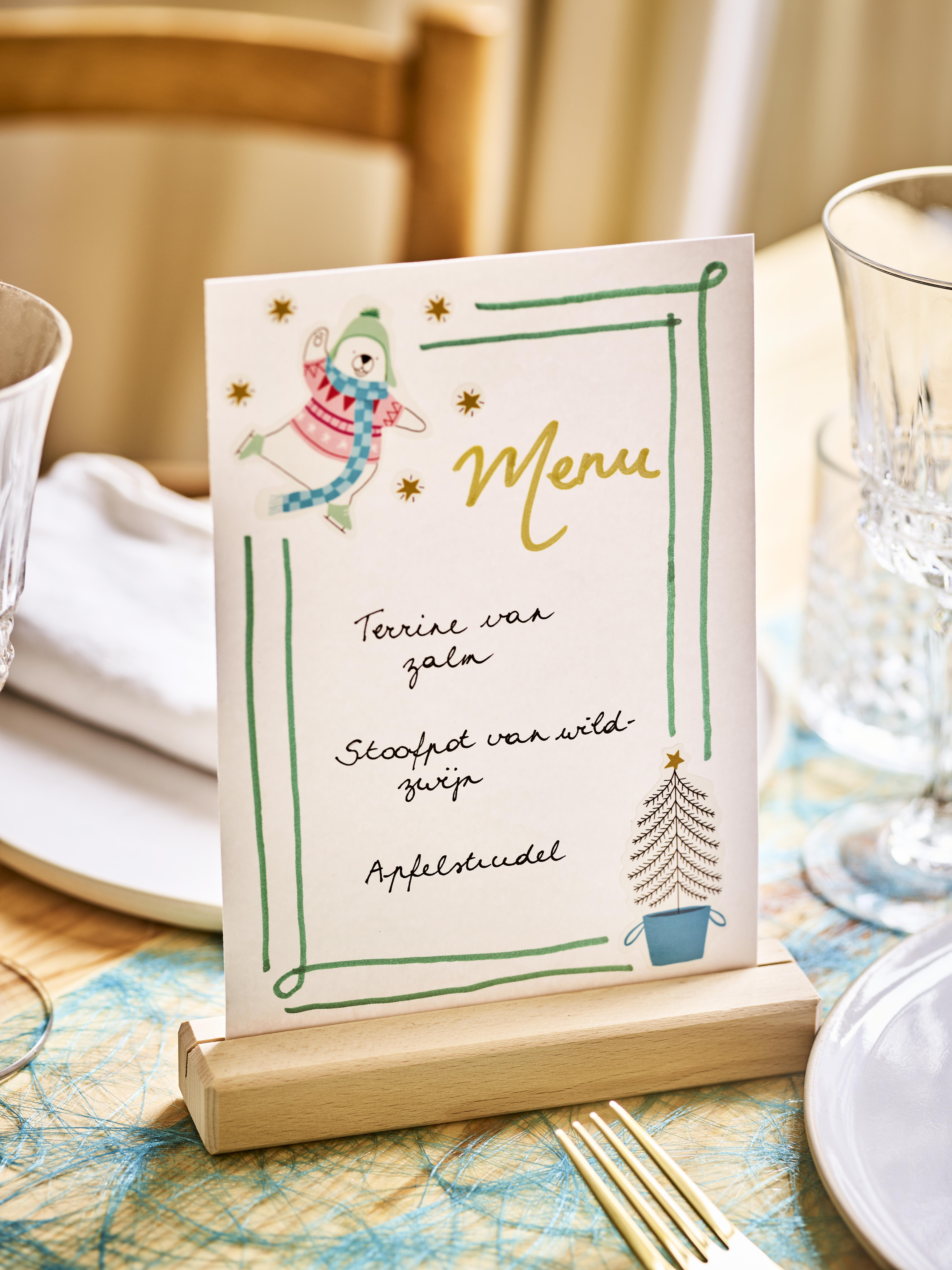 Verras je gasten met een feestelijk menu dat extra cachet geeft aan je feest. Plak hier en daar stickers op het menu en werk met glitterstiften voor een extra fonkelend effect.