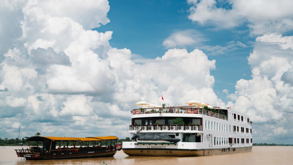 Met de bus laten we de stadsdrukte achter ons en rijden richting My Tho, een stadje aan de Mekongdelta waar ons avontuur pas echt gaat beginnen. Voor ons ligt de Marguerite, een prachtig, koloniaal schip dat de komende acht dagen onze thuis zal worden.