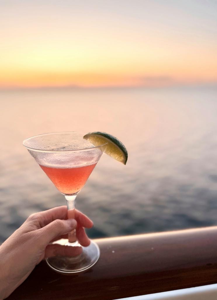 En dan weerklinkt plots het lied ‘Bamboleo’ van The Gipsy Kings en zwiert het hele restaurant met witte servetten boven het hoofd. Een must op een cruise! Maar daarna is mijn pijp uit. Ik zou nog naar de theatershow kunnen gaan die avond, naar de tangoles, de juwelenverkoop, de sudoku-challenge, de yogales of de gratis haaranalyse. Maar ik ga naar de bar, vraag een cocktail en ga ermee op mijn balkonnetje zitten. Het is halfnegen ’s avonds, stil en de zon gaat onder. Mijn sapje matcht geweldig goed met de oranjeroze gloed boven de oneindige zee. Ja, dit is echt het beste plekje van de hele cruise.