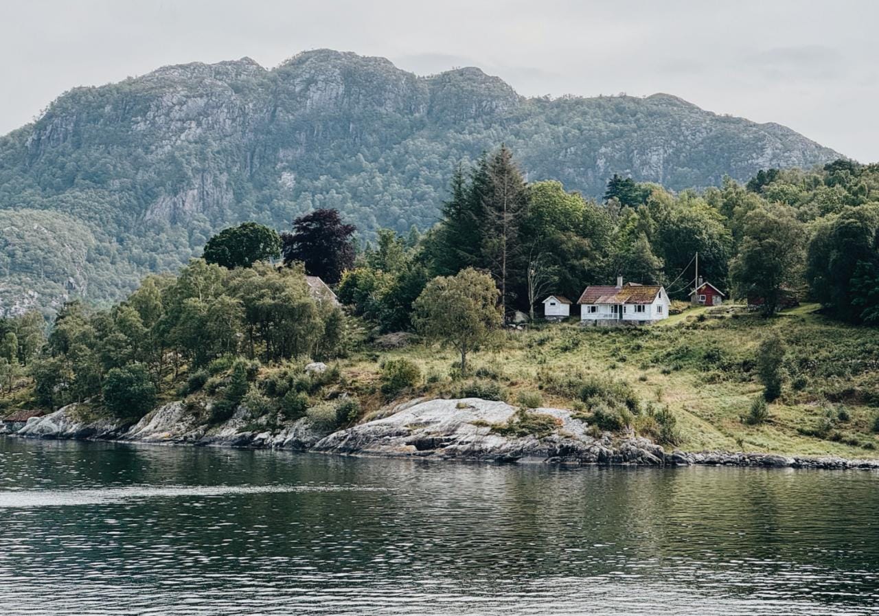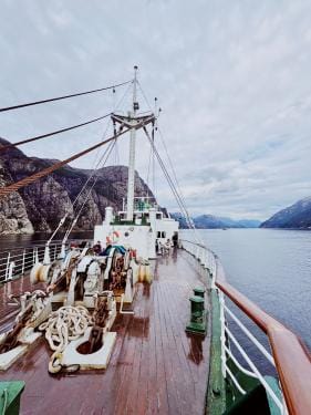 Wanneer ik de volgende ochtend de gordijnen van mijn kajuit open, blijkt dat we intussen de haven van Stavanger zijn binnengegleden, een stad in het zuiden van Noorwegen. Vanop mijn balkon zie ik in de verte bergen en eilandjes verspreid in de stille wateren.