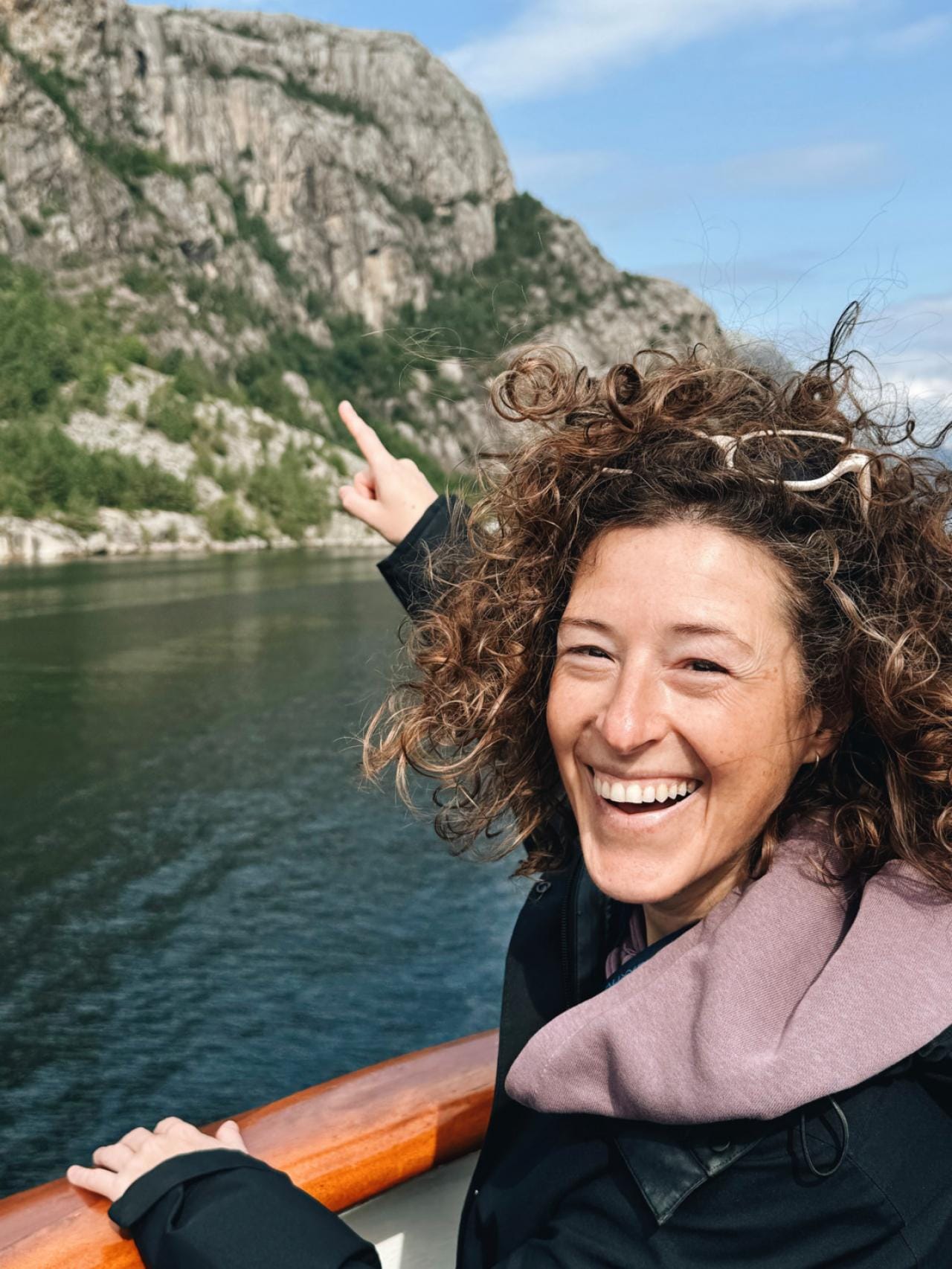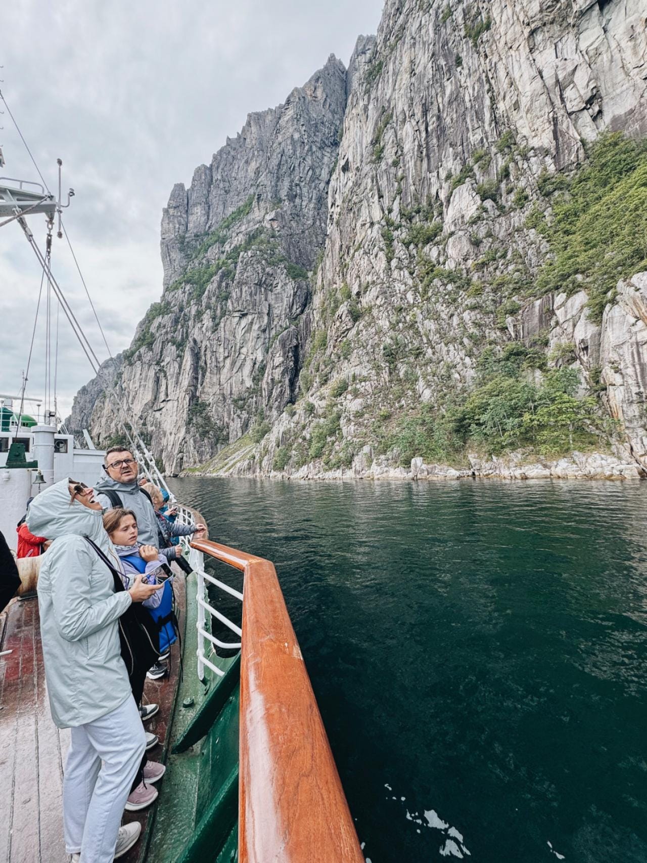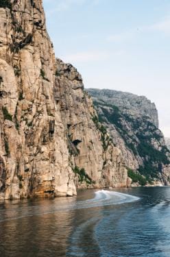Niet zo veel later stappen we over op een authentieke houten schuit en varen we de prachtige Lyse-fjord in. Links en rechts van ons worden de muren van graniet steeds steiler en hoger, tot we aan ‘Pulpit Rock’ komen, ook wel de ‘Preekstoel’ genoemd – een iconisch plat stukje rots dat 604 meter boven ons uittorent. Je kunt ernaartoe wandelen, maar wij hoeven alleen maar naar omhoog te kijken om dit natuurschoon te bewonderen. Hoe makkelijk is dat. Het enige risico is een stijve nek achteraf.