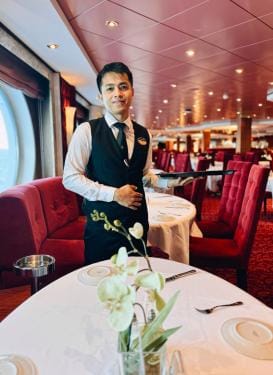 Maar eerst moet ik op zoek naar kajuit 10228. De doolhof van gangetjes doet me denken aan filmklassieker ‘Titanic’. Alleen zwemt Leonardo DiCaprio hier niet door de gangen, maar word ik begroet door Bryan, de uiterst attente kamerjongen. Hij zal elke dag de kajuit poetsen en als ik een vraag of hulp nodig heb, staat hij paraat. Hij leeft hier al maanden op zee en weet dus een ietsiepietsie beter dan ik waar stuurboord en bakboord zijn, en waar ik het juiste restaurant vind of het zwembad op het dek.