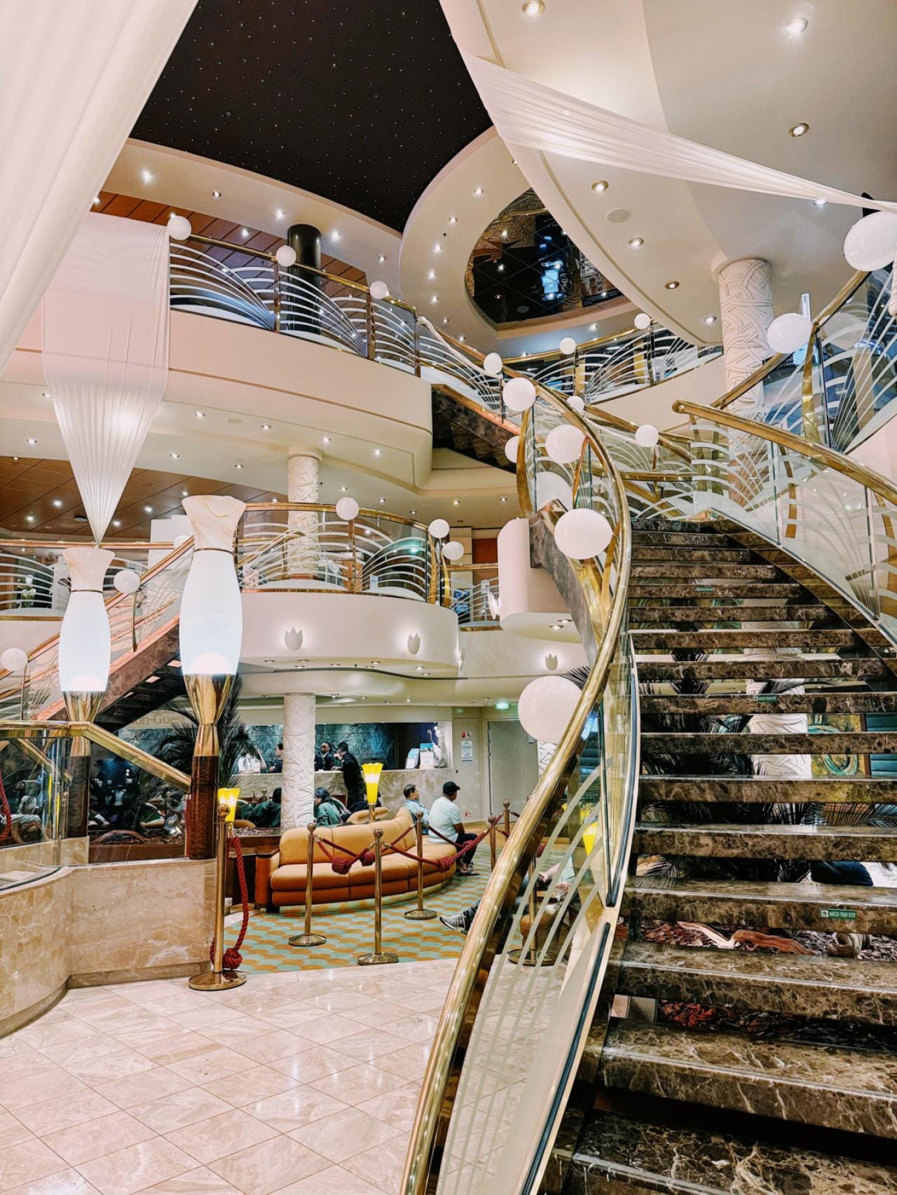 Wie nog nooit een zeecruise heeft gedaan, kan de eerste dag wat duizelen. Dat is bij mij alleszins het geval. Het schip binnenkomen, is ronduit indrukwekkend en de hoeveelheid spiegels, glittertrappen en zebratapijtjes doet me even knipperen met de ogen.