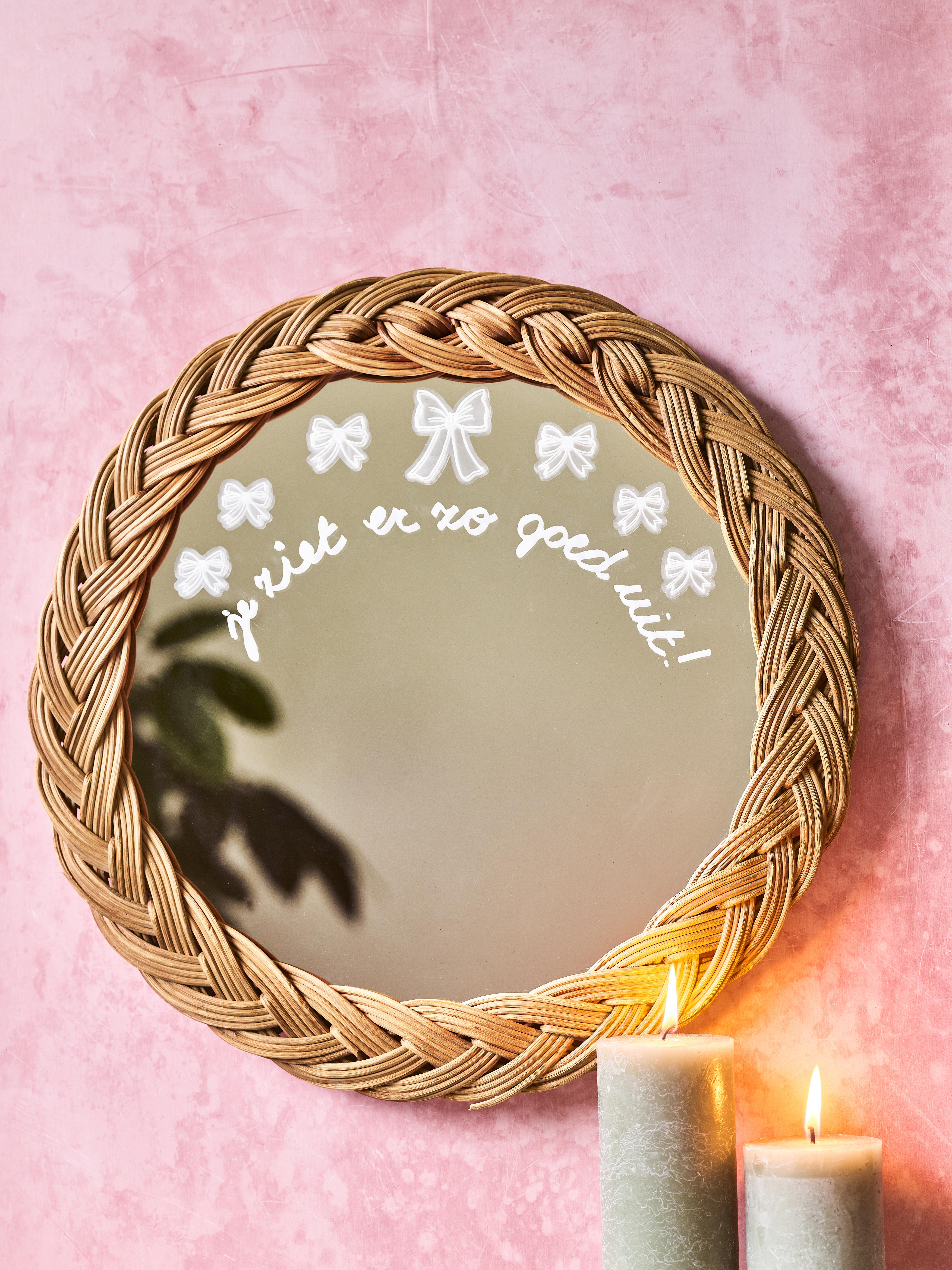 Een mooie boodschap voor gasten in het kleinste kamertje of gewoon een dagelijkse herinnering voor jezelf! Kleef de strikken vanuit het midden van de spiegel van groot naar klein en werk af met een positieve tekst in krijtstift.