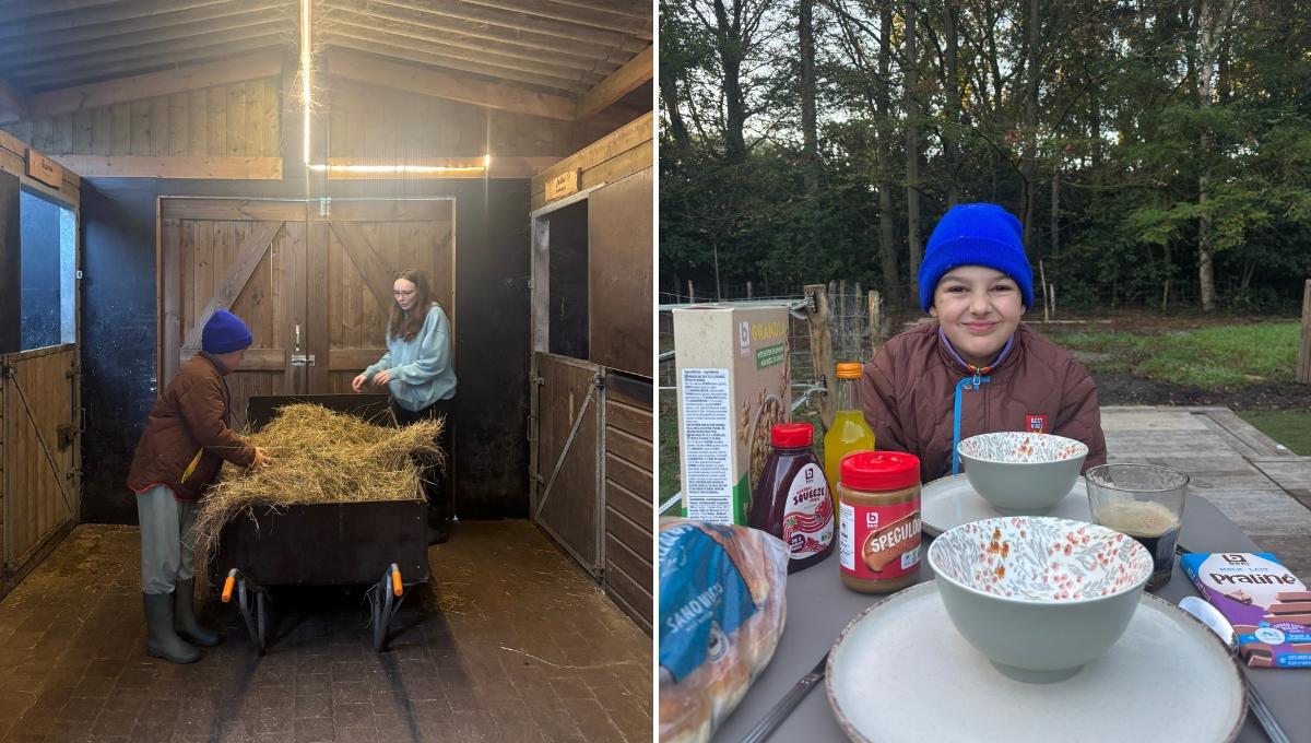 Zodra de paarden ontbeten hebben, is het aan ons. In de Tiny House staat voor Dex en mij een uitgebreide ontbijtmand vol BONI-producten klaar. Denk: muesli, sandwiches, speculaaspasta, confituur, rijstwafels met pure chocolade en maïswafels. Dex en ik kleden ons warm aan en ontbijten op ons terras. Ram Billie houdt ons ondertussen nauwlettend in de gaten.