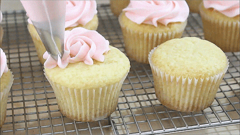 Houdt de spuitzak loodrecht op de bovenkant van de cupcake. Druk de topping zachtjes in het midden en maak een spiraal tot aan de buitenkant.